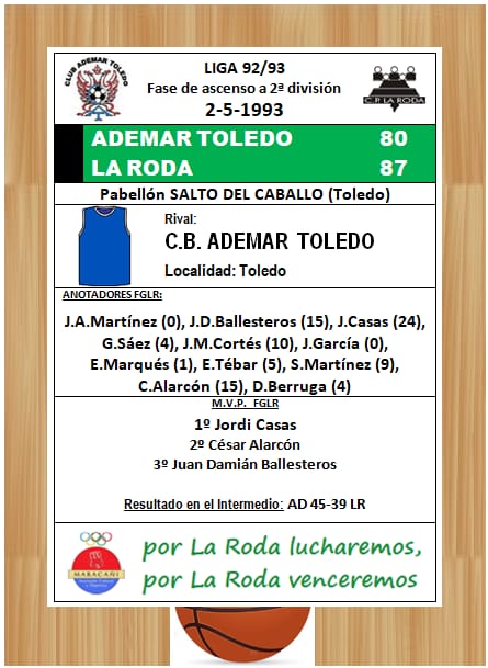 En esta segunda fase el CAJA RURAL LA RODA empezaría jugando y ganando en casa al gran favorito para el ascenso, el ADEMAR TOLEDO. Un espectacular partido con un pabellón abarrotado, un día más. Esa victoria hizo creer a equipo y afición que no había que ponerse techo. Las seis victorias y solo dos derrotas en esta fase de ascenso nos metieron en la Fase de Ascenso definitiva, que se celebraría en Toledo los días 30 de abril y 1 y 2 de mayo de 1993.
