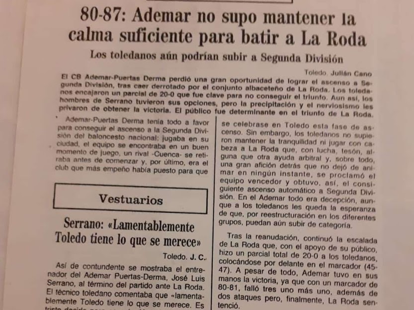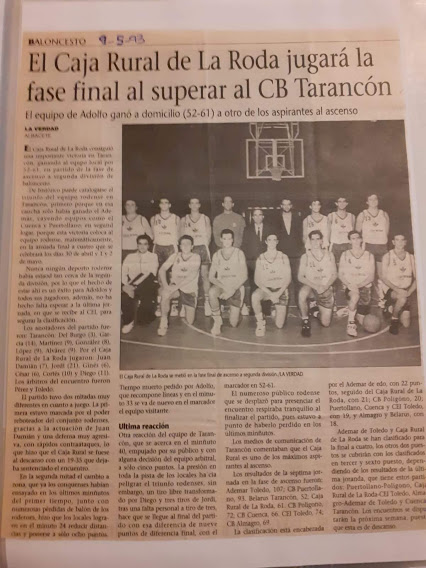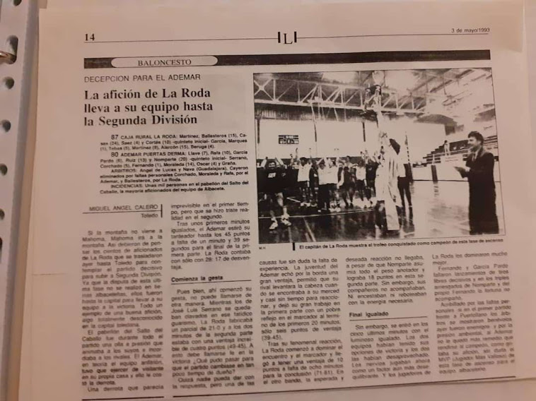 Eso citaba en algún periódico de la época. Y es que hubo ruido durante la parte final del año con la posibilidad de que esa Fase Final de Ascenso se jugara en La Roda pero finalmente fue el ADEMAR TOLEDO el equipo que la organizó.