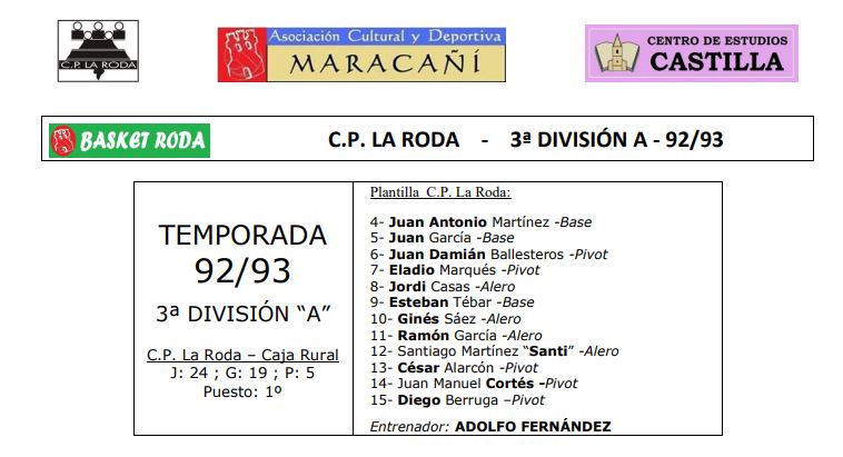Pero el equipo jugaría ese año a un grandísimo nivel en ambas partes de la pista. Y el resultado de ese día, 17 de octubre de 1992, no dejó lugar a dudas. La Roda vencía a CB INFANTES por 116-73. Luego vendrían dos derrotas consecutivas a domicilio, en Puertollano y en Cuenca, dos de los equipos más grandes de la liga. Puertollano, con Lucio, Pepín, entre otros, y el CB Cuenca de “Branson” se clasificarían para jugar la definitiva fase de ascenso en el mes de mayo.