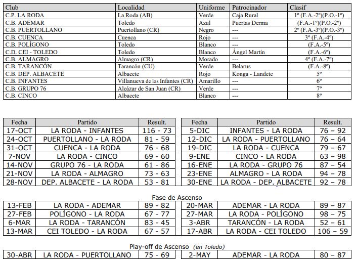En la Fase de Ascenso nos presentamos ante tres rivales muy respetados que al final fueron solo dos por la renuncia de Cuenca. Dos rivales que a nivel regional siempre habían sido referente, Puertollano y Ademar Toledo. Dos ciudades pioneras en el baloncesto regional y La Roda que partir de ahí se fue haciendo un hueco entre los grandes de la región.